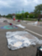 Sometimes, despite all our best efforts, the rain wins. When it looks like that will happen no matter what, or I have a client that wants to avoid damage as much as possible, we can always leverage other materials. This might mean doing the artwork with acrylic paint on vinyl, or using tempera paint on the ground to hold up better to the elements. Tempera paint is washable, but water-resistant, making it a great option for outdoor art in unpredictable weather.